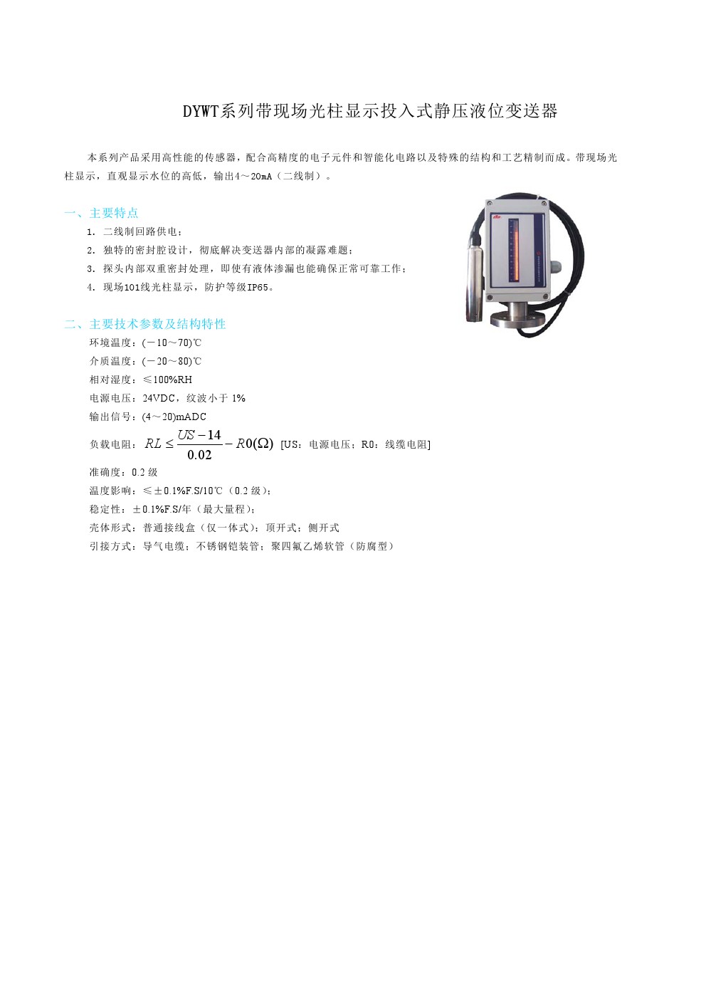 DYWT系列帶現(xiàn)場光柱顯示投入式靜壓液位變送器